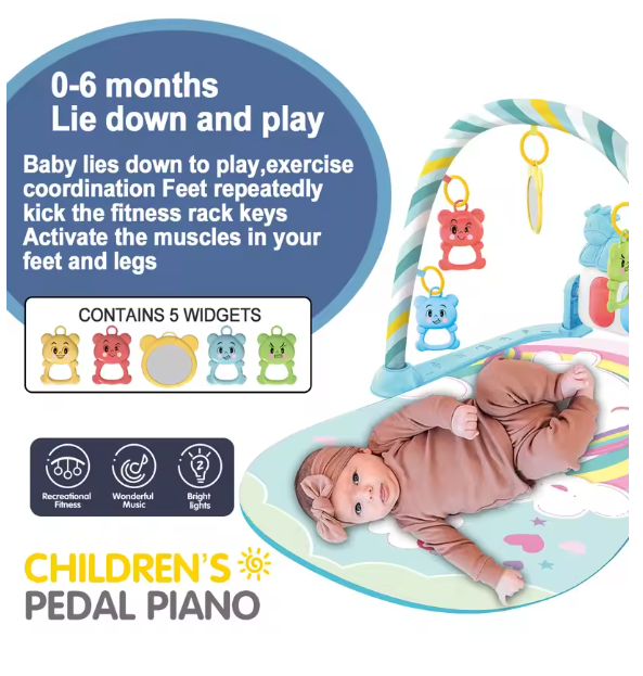Featuring colorful hanging toys, musical lights, and soft textures, this play gym helps develop your baby’s motor skills, hand-eye coordination, and auditory awareness. The hanging rattles and toys encourage your newborn to reach, grasp, and kick, promoting arm and leg movement that supports muscle growth and early learning.